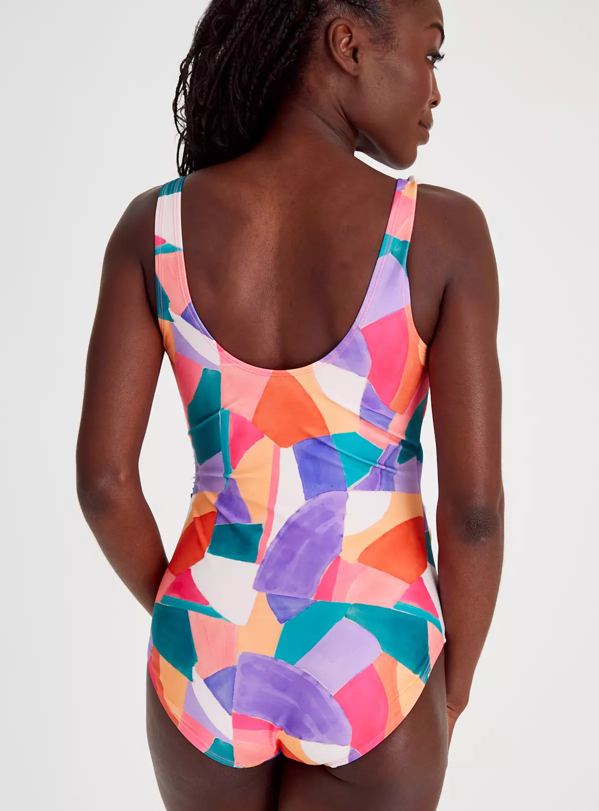 This fabulous swimsuit combines style and comfort, perfect for beach days, summer holidays or laps around the local pool. Designed in a gorgeous bright abstract print, it has a wrapover front and padded cups for added shape and support.