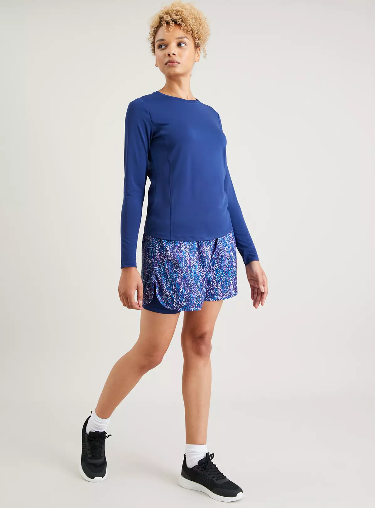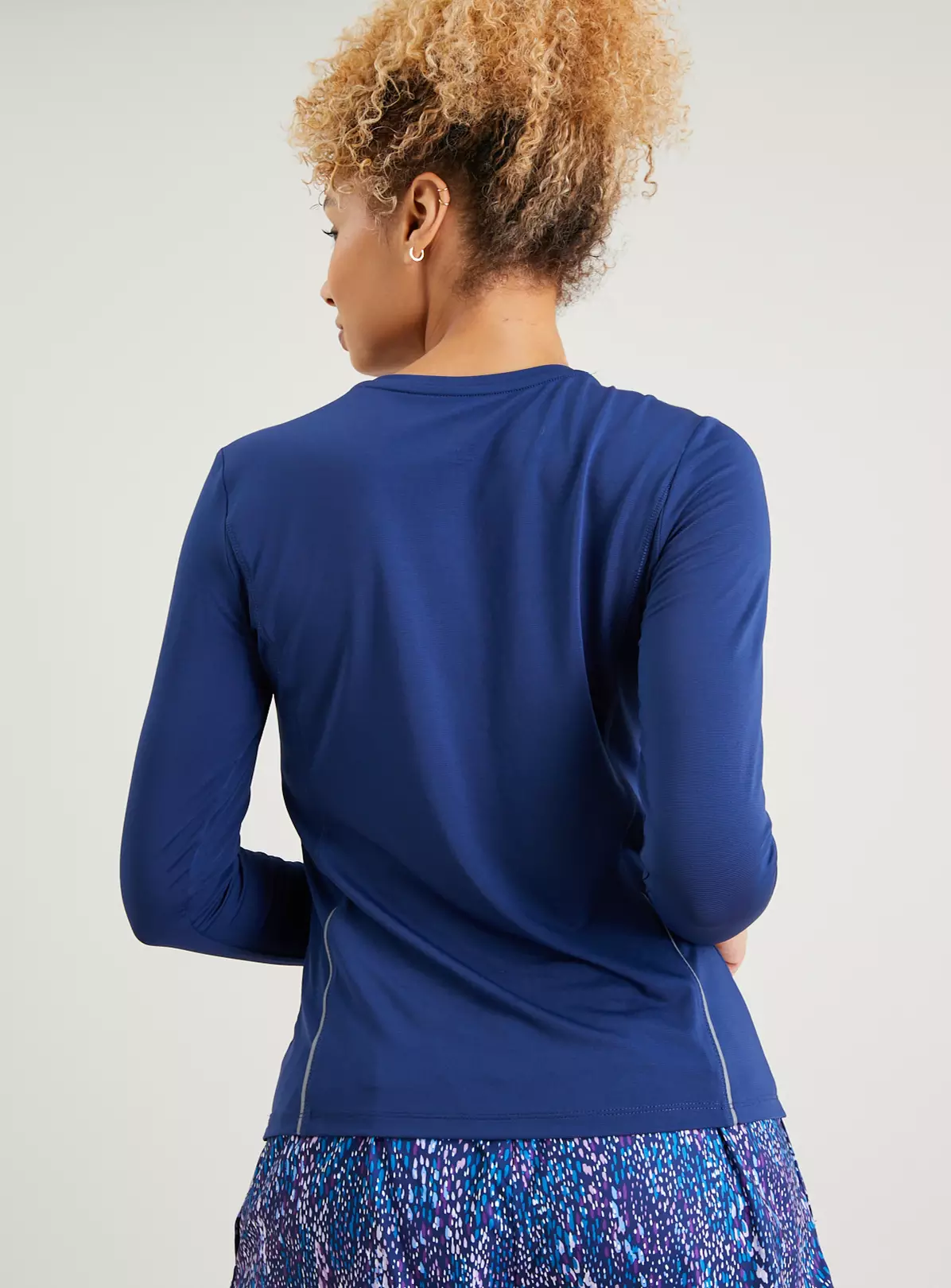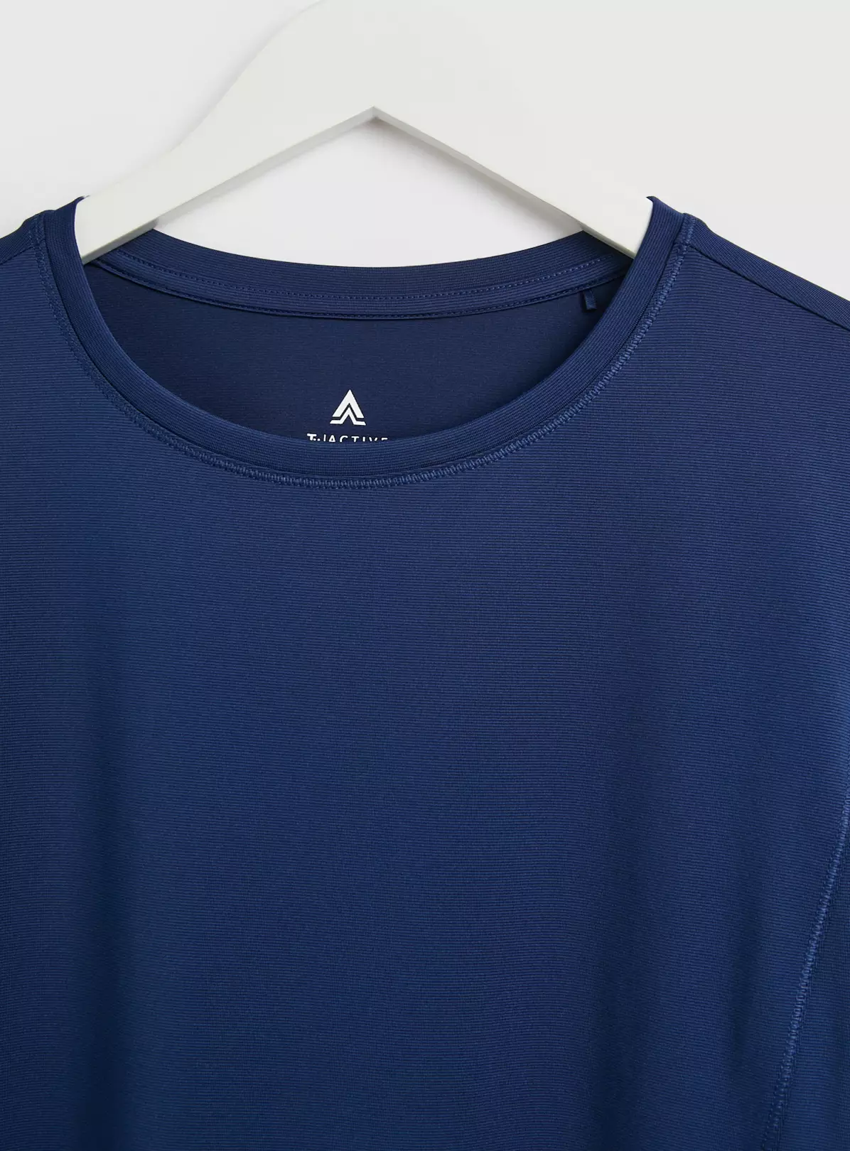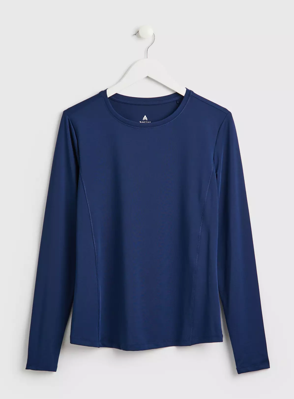 Workouts just got a little easier thanks to this navy long sleeve top from the Tu Active range. The moisture wicking technology allows the air and moisture to pass more freely through the fabric, and the quick dry finish will keep you fresh as you work up a sweat. Blended with recycled fibres.