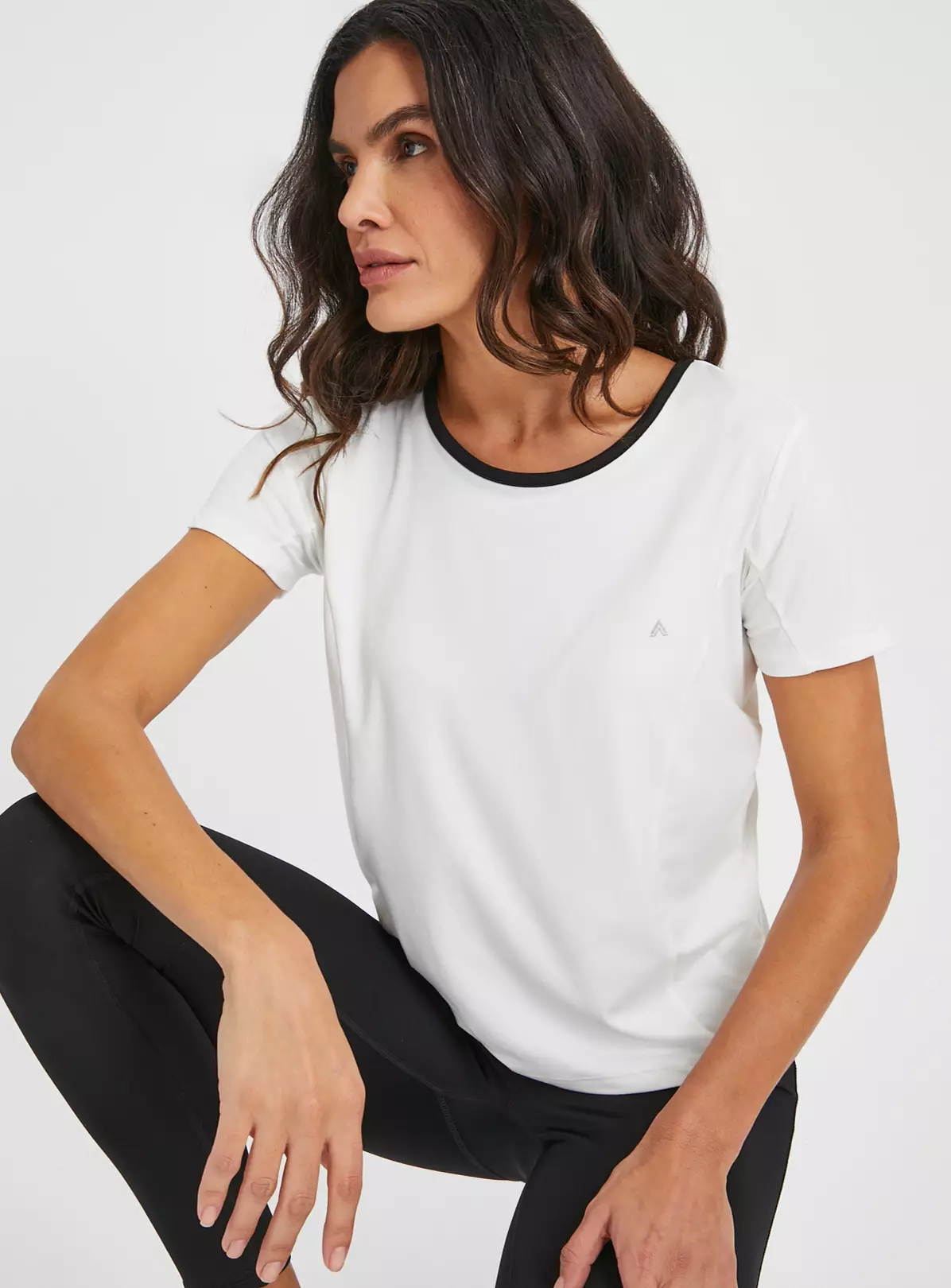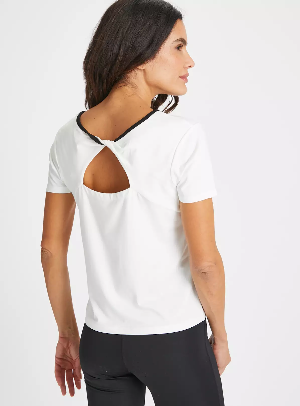 Refresh your gymwear wardrobe with our Active white t-shirt. Elevated by a stunning twist back design, it features a black contrasting detail on the neckline. Perfect for pairing with your yoga pants and gym leggings.