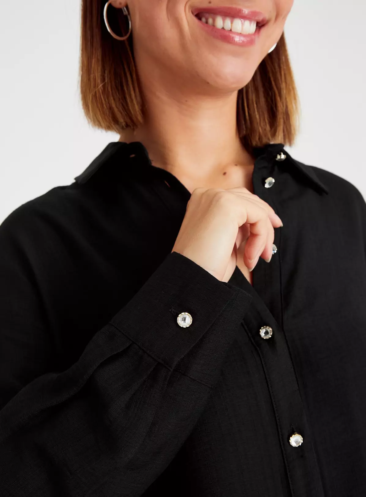 Jump on the oversized shirt trend this season! Our black shirt features stunning diamonte values, which gives your outfit a show-stopping look! The perfect piece to wear to evening meals and parties, this shirt looks great paired with faux leather trousers and heels!