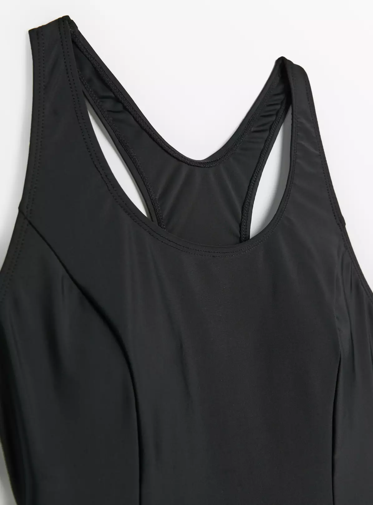 A comfortable choice for holidays and trips to the local pool, our black swimsuit comes in a shorts-style. It has a scoop neckline and features a side stripe design for a chic touch. An essential for your swimwear collection!
