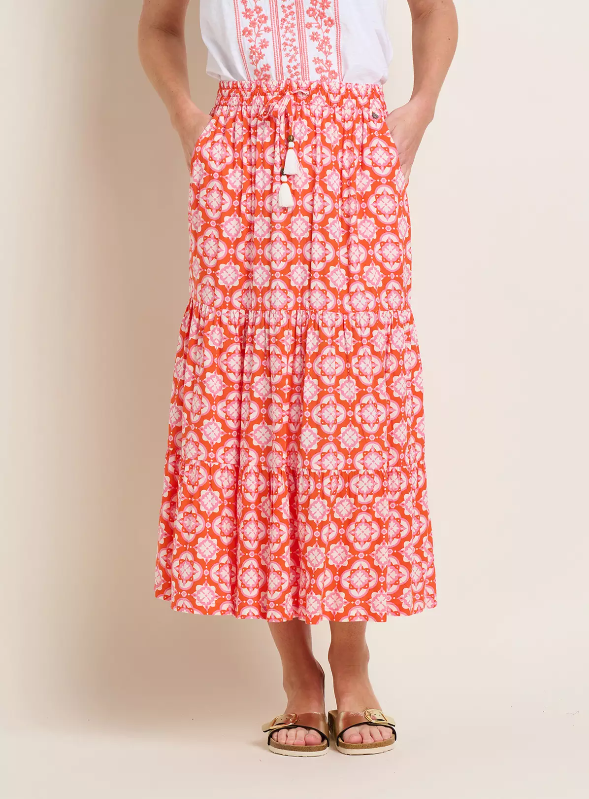 Tiered maxi skirts are made to move. The Brakeburn Moroccan Tile maxi skirt is vibrant, lightweight and has beaded tassels at its elasticated waist. Wear with a camisole or plain cotton vest with sandals at the beach or for laidback evenings out.