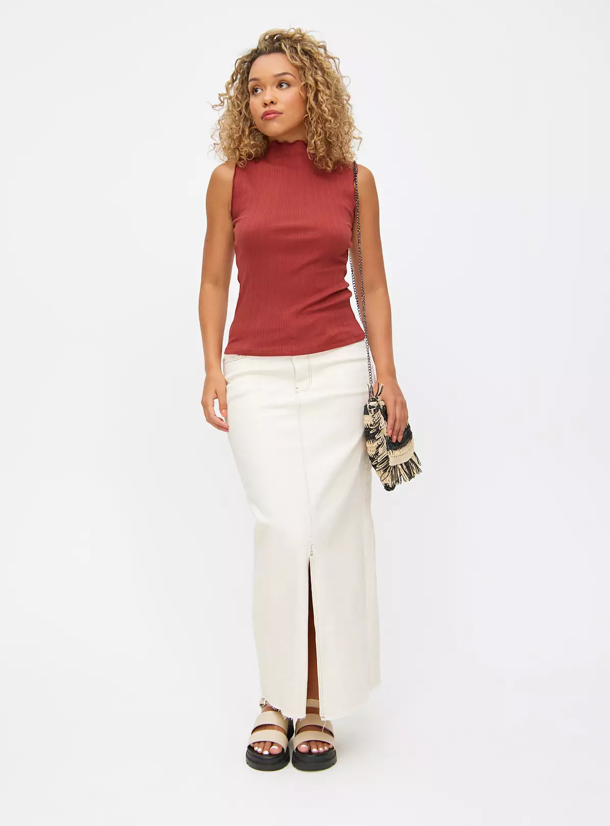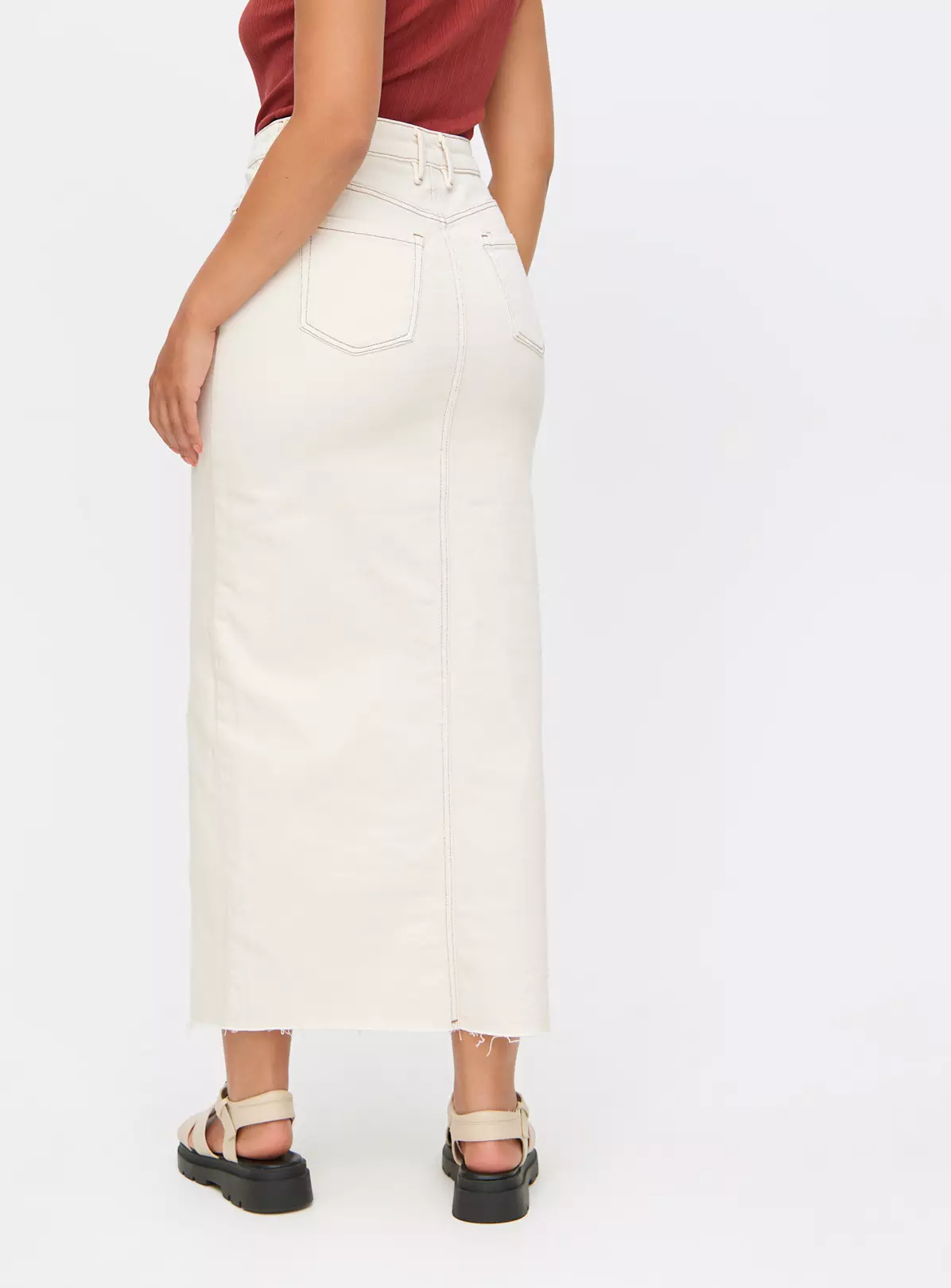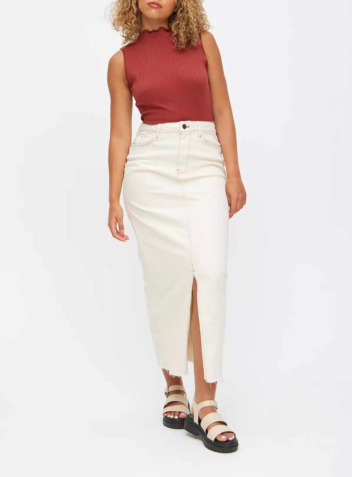 Fresh from our denim edit, our ecru denim skirt features a flattering front split and comes in a maxi length. Designed for simple yet stylish everyday wear, team it with a boxy fit t-shirt and a pair of tan sandals.