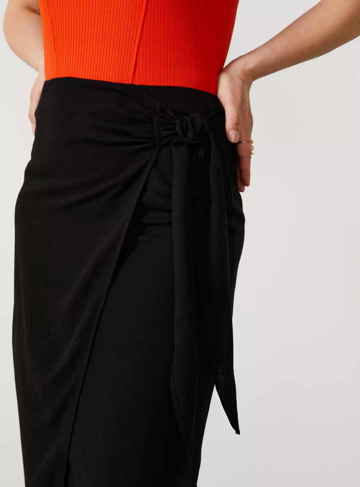 - Designed with a fixed sarong style wrap and self-tie at hip