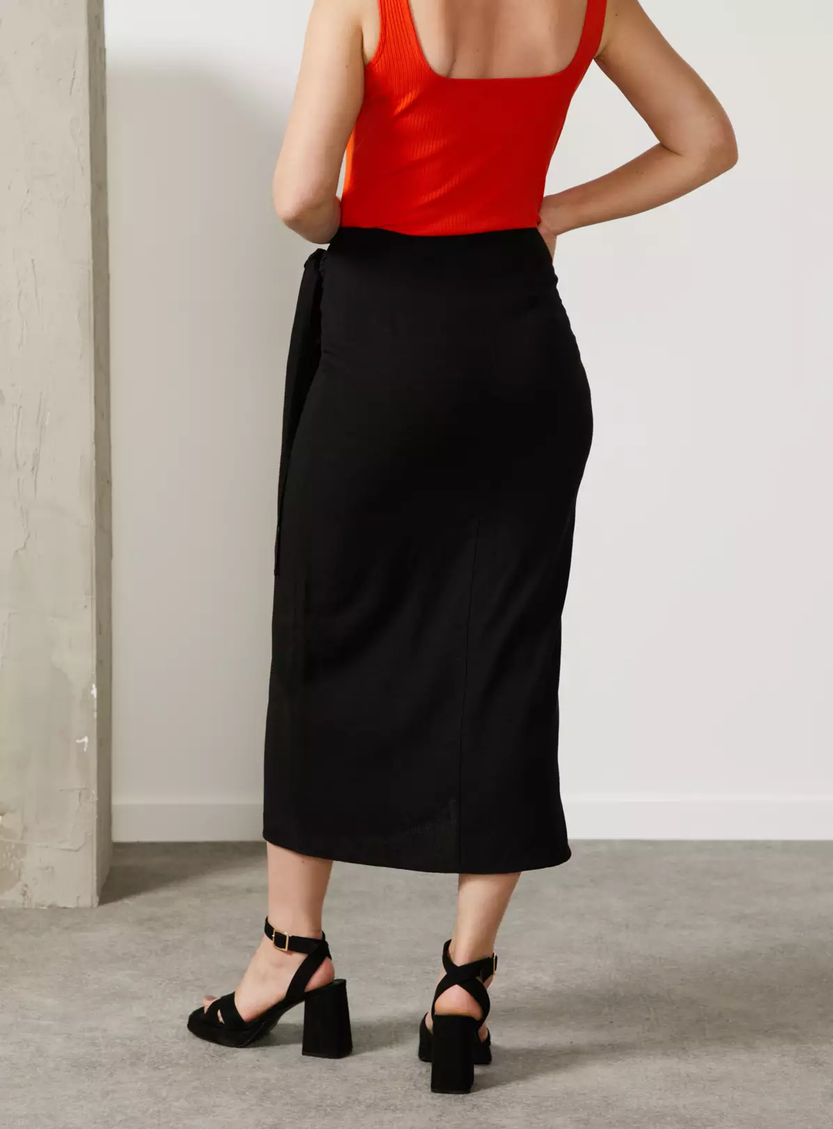 - High-waisted linen blend midi sarong skirt in classic black