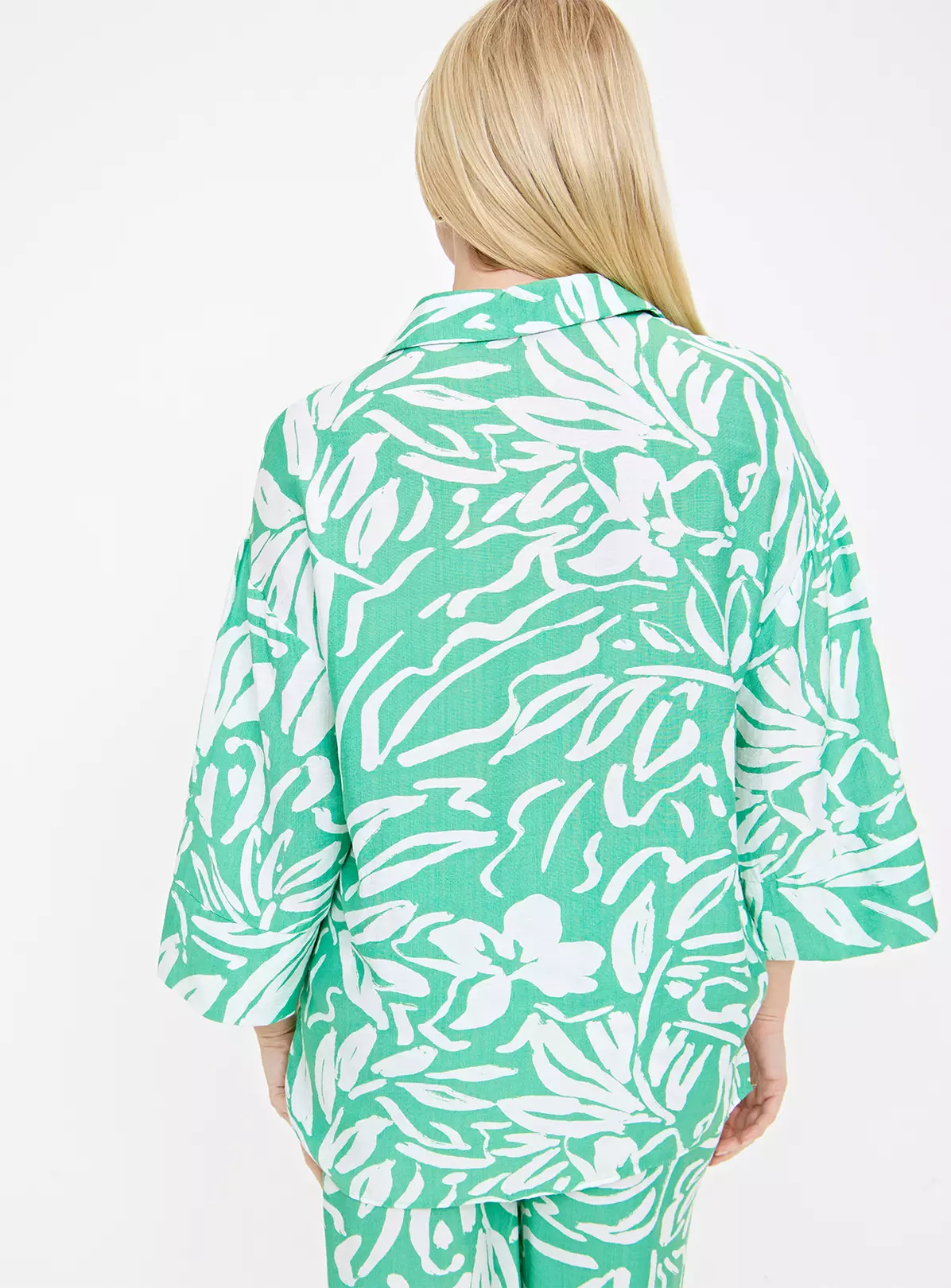 Add a pop of colour to your shirt collection with our green number. In an oversized fit, it features an on-season leaf design. Style it with our coordinating wide leg trousers for a statement spring look.