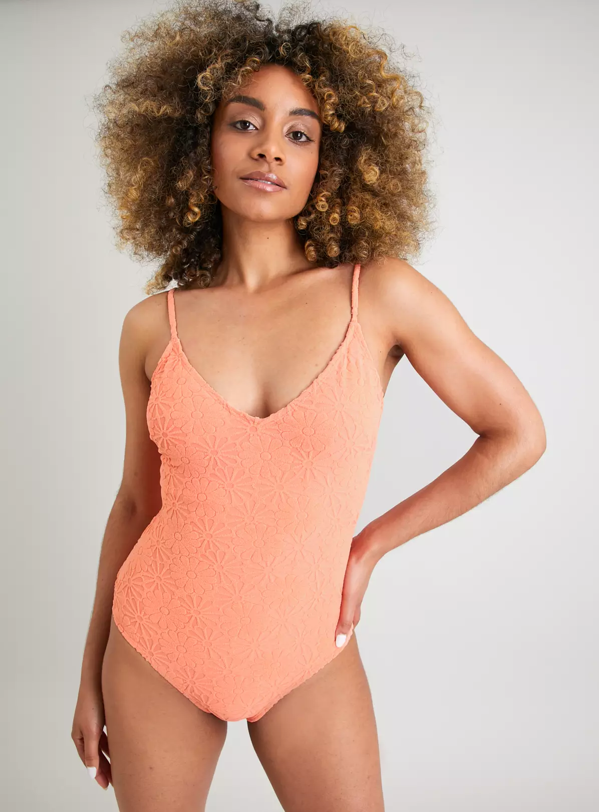 In orange with a gorgeous floral pattern, towelling texture, V-neckline and spaghetti straps, this swimsuit can double as a top it looks that good! Perfect for relaxing on holiday, at the pool bar or catching a tan. Throw on with a denim skirt and sandals in the daytime for a beach ready fit.