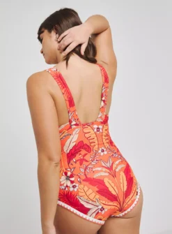 This red polka dot swimsuit with moulded section and padded cups comes in a wrap style for a flattering look. Team with pool sliders for the finishing touch to your poolside outfit. Made with recycled yarns.