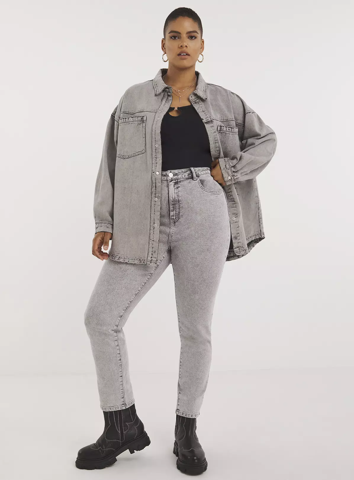 Our best selling slim mom shape jean is back in a new wash this season! It features a gorgeous grey wash, flattering slim mom shape, high rise waistband, front and back pockets and a zip and value fastening. Simply pair with trainers and a tee or dare to wear with our matching shacket for a totally cool double denim look.