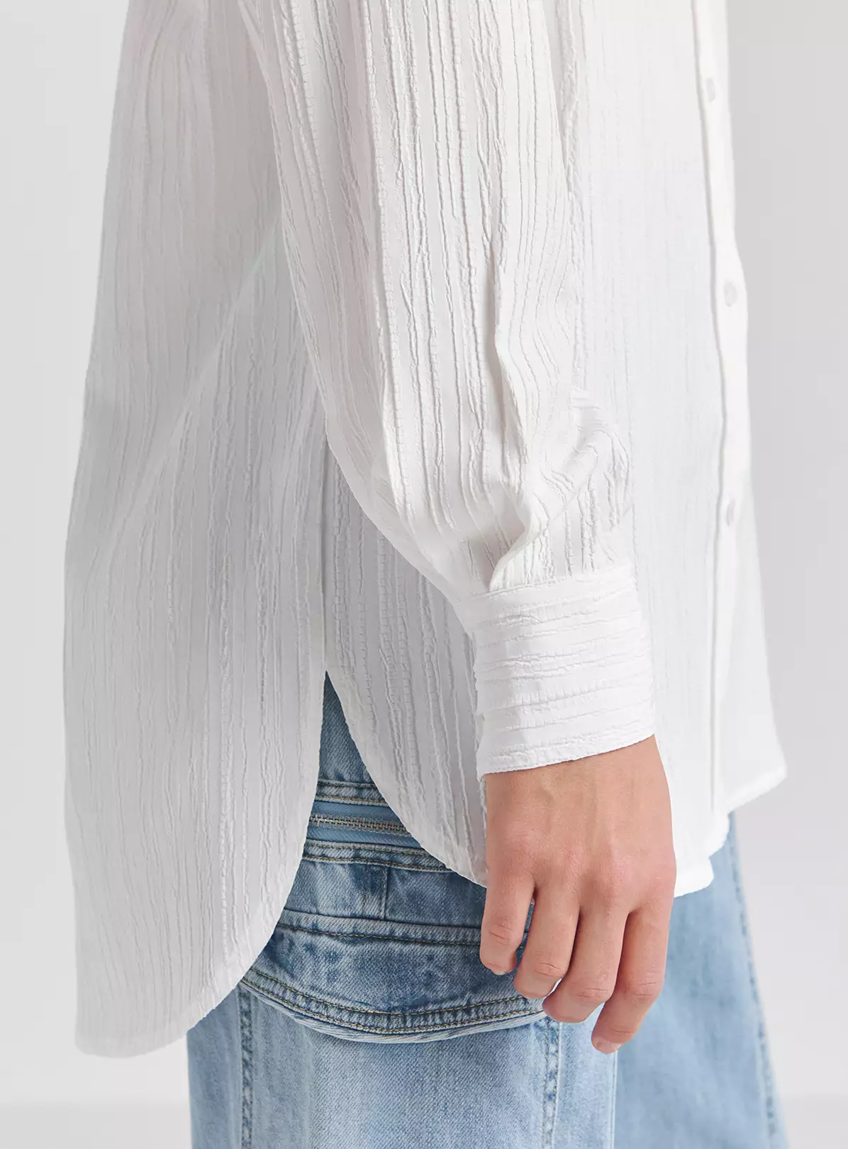 Look stunning in textures this season! Shop this stunning white textured shirt featuring our best selling dipped back shape for the most flattering fit and feel. Simply pair with jeans and chunky trainers for the most perfect, effortess everyday look!