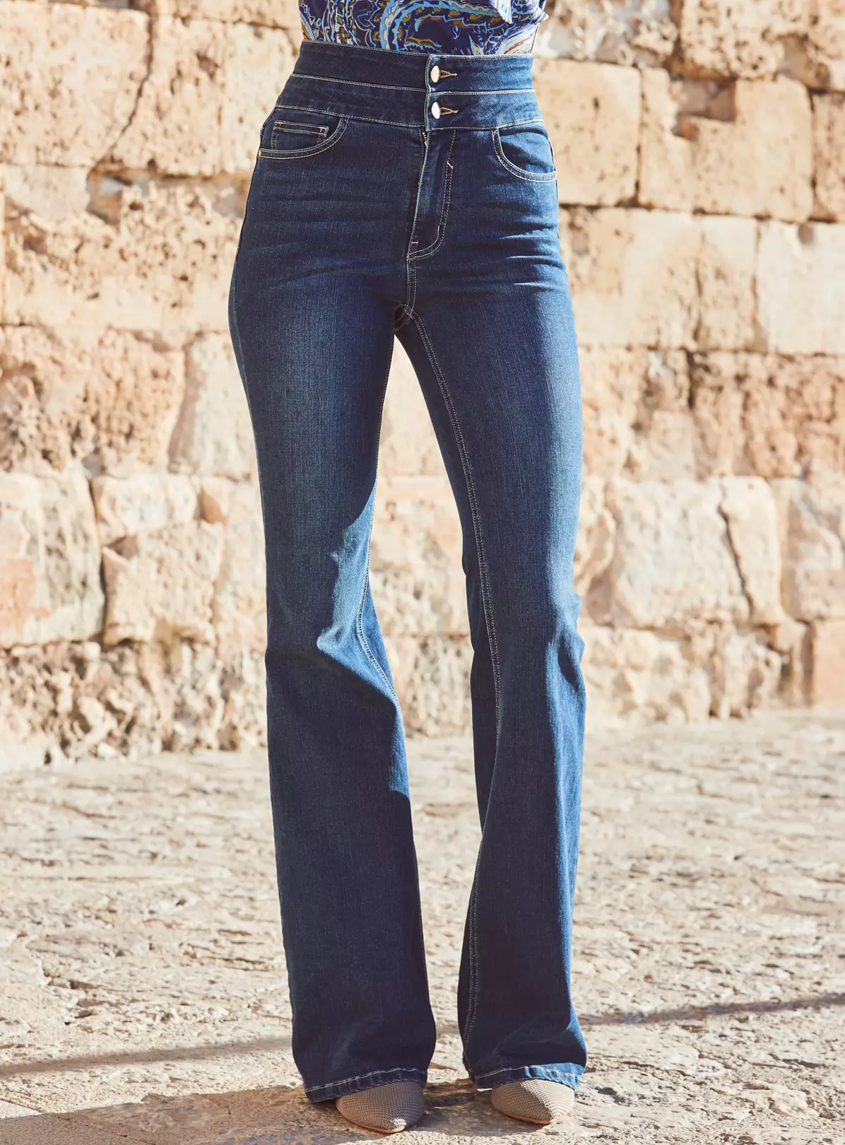 The jeans of your dreams, clever contouring waist for confidence guaranteed, figure-enhancing leg-lengthening kick flare cut, soft stretch denim for the perfect fit, statement double value detail, create the illusion of endless legs with pointed courts and boots.