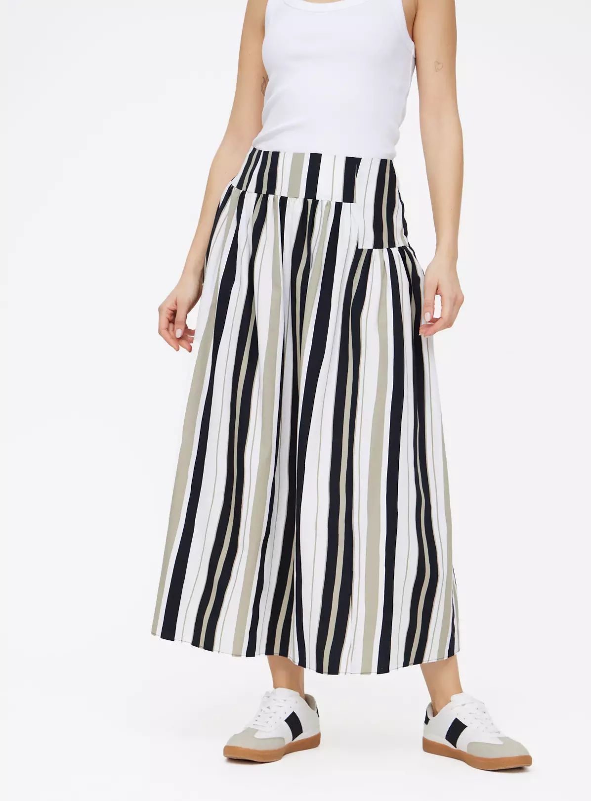 Make a statement this season in our midaxi poplin skirt. With bold stripes and a wide waistband, it’s perfect with a black knitted jumper and a pair of black boots.