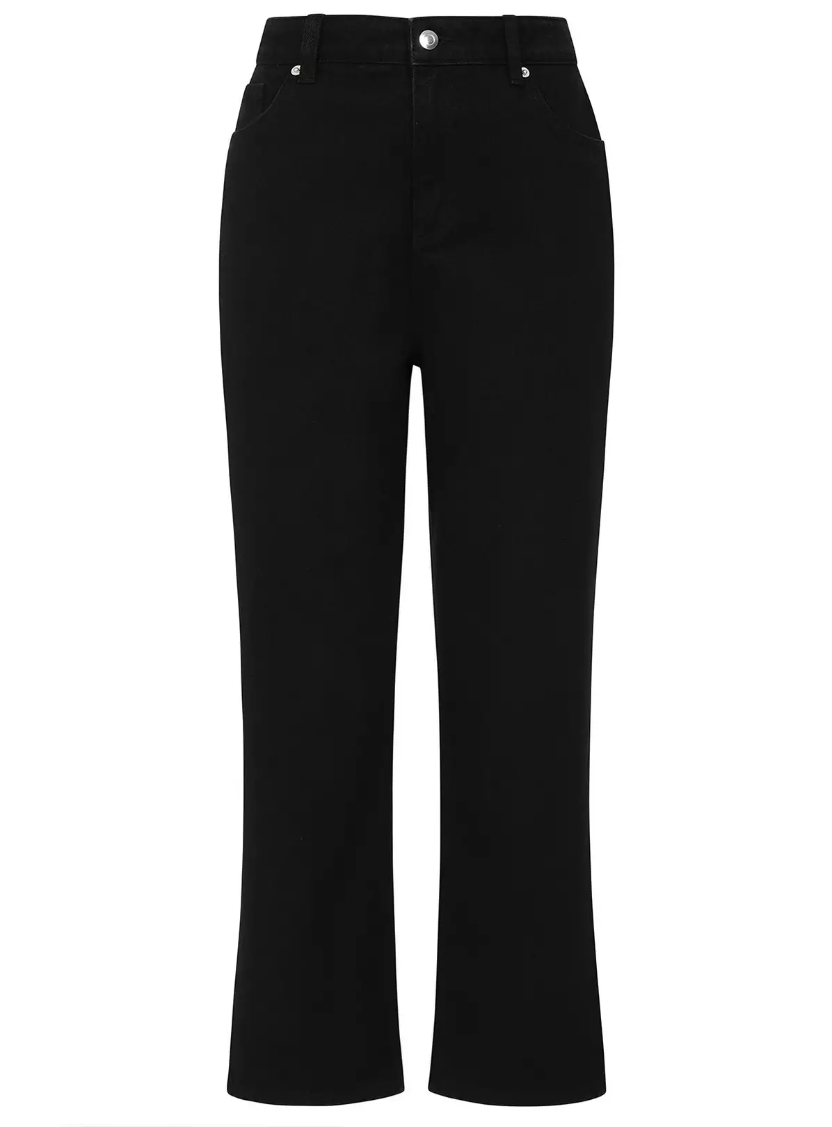 Black denim mom jeans, relaxed fit with gently tapered legs and a high waist design. Button and zip fly closure.