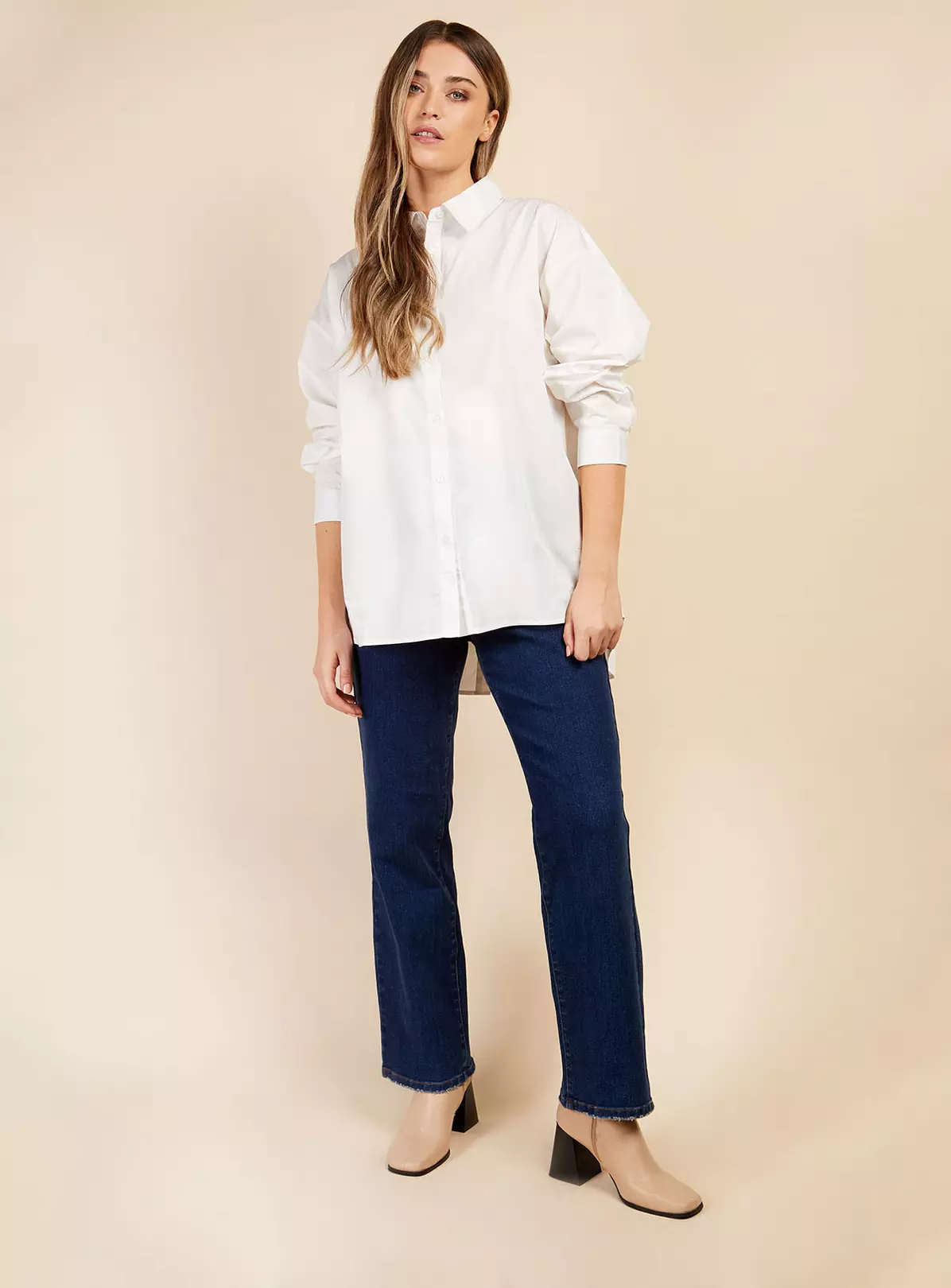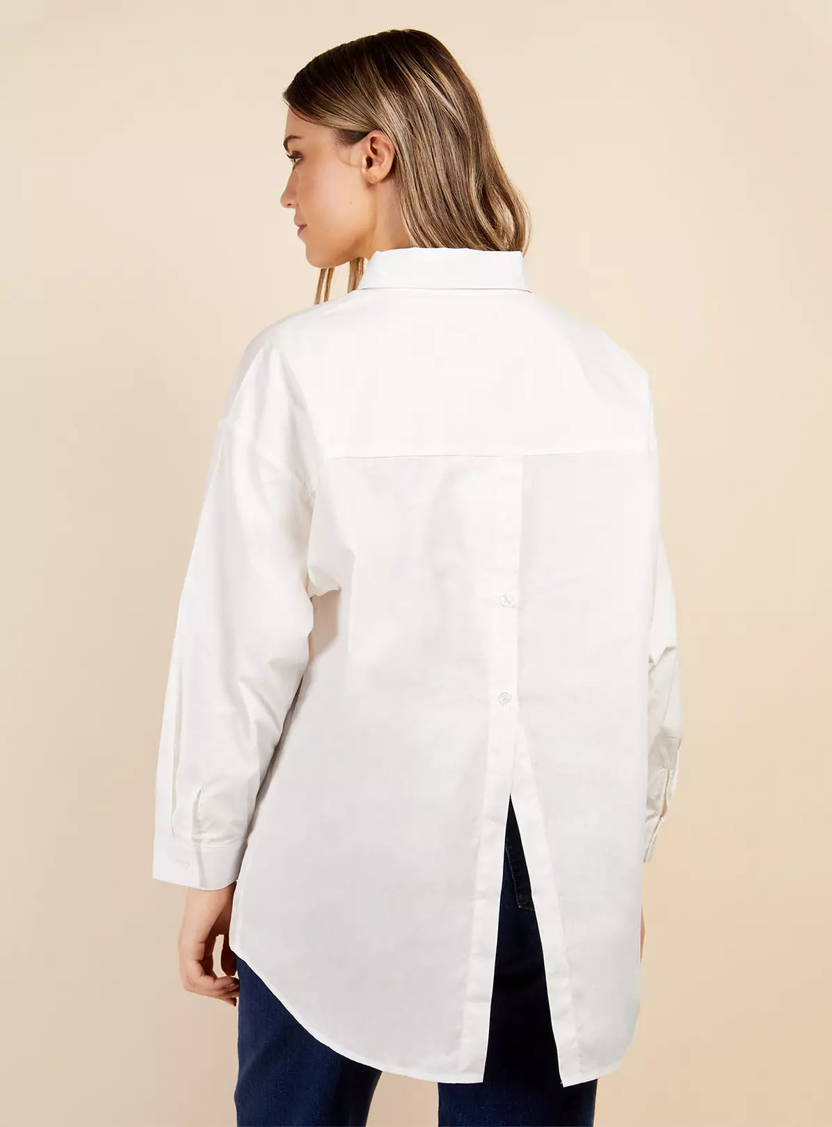 The classic white shirt just got a little more fun. A split back design ups the anti on this timeless wardrobe staple. designed in an oversized silhouette complete with balloon sleeves and longline length. Pair with jeans and a biker boot for the ultimate in off-duty chic.